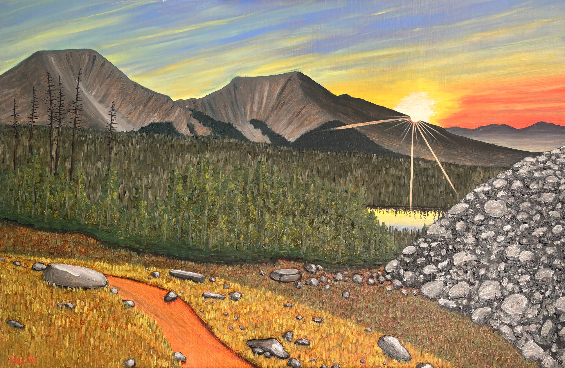 An original painting of a sunrise on the Continental Divide Trail. I took the reference photo while on a bikepacking trip with friends. We camped the night before at the lake below. I loved how the sky looked and the light reflecting off the lake.